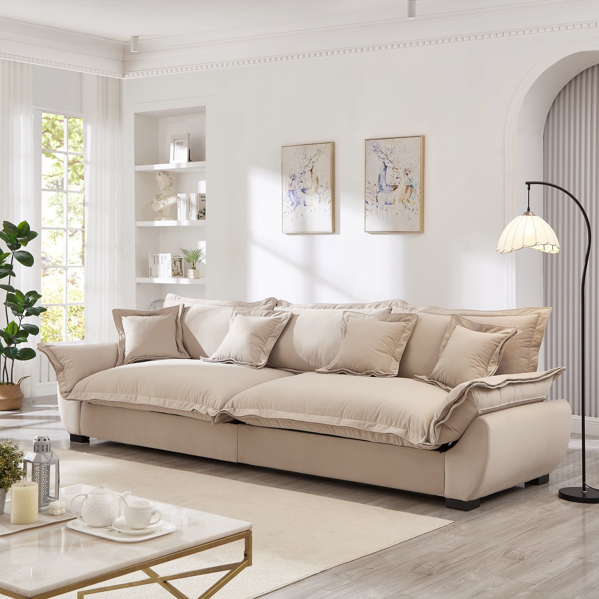 GAKMCIL 126" Velvet Modular Sectional Sofa, 3 Seater Sailing Design Upholstered Sofa, Deep Seat Cloud Sofa with Storage, Removable Backrest, Throw Pillows for Living Room, Apartment (Light Khaki)